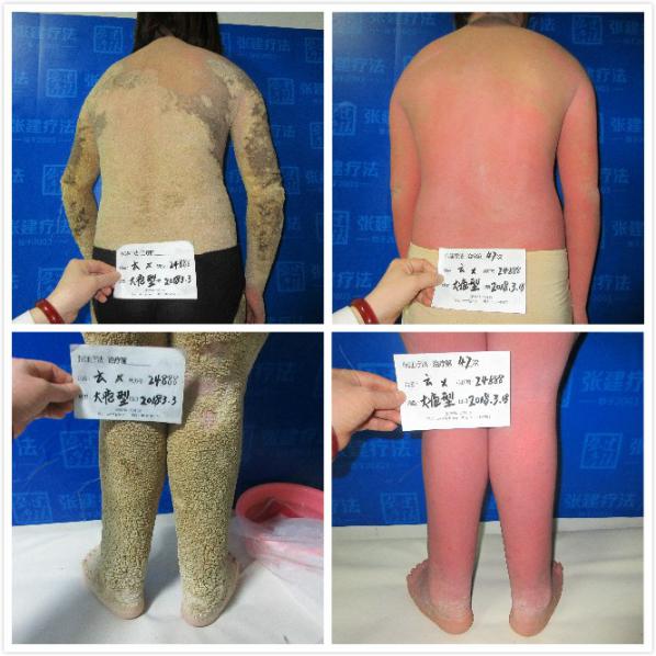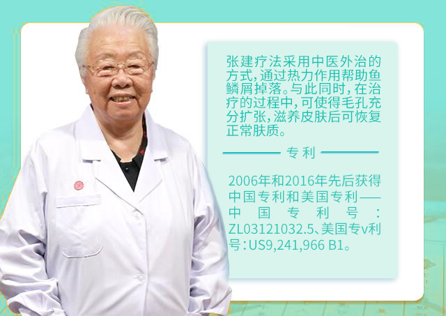 張建療法采用中醫外治的方式,通過熱力作用幫助魚鱗屑掉落。與此同時,在治療的過程中,可使得毛孔充分擴張,滋養皮膚后可恢復正常膚質 在2006年和2016年先后獲得中國專利和美國專利 中國專利號:ZL03121032.5、美國專利號:US9,241,966 B1。